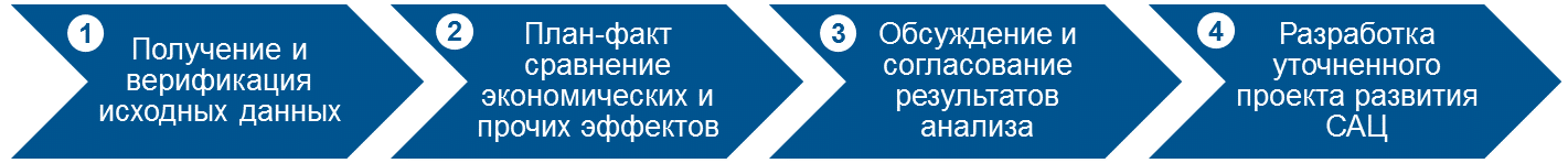 4. По итогам выполнения предыдущих шагов и согласования их результатов всегда необходимо внести уточнения в различные аспекты проекта развития САЦ: проектные решения, состав и требования к инфраструктуре, охват следующей волны развёртывания и прочее.