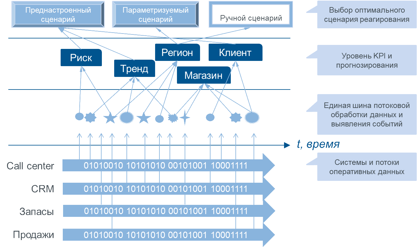 Ключевой особенностью современного ситуационного центра является потоковая обработка разнородных данных и выявление событий в режиме on-line. Это позволяет выявлять как уже свершившиеся события и ситуации, так и потенциально опасные ситуации в ближайшем будущем согласно заложенным на этапе проектирования моделям и сценариям реагирования. При этом обеспечивается полуавтоматический/ автоматический запуск оптимальных сценариев реагирования. Ниже приведен пример такой архитектуры: