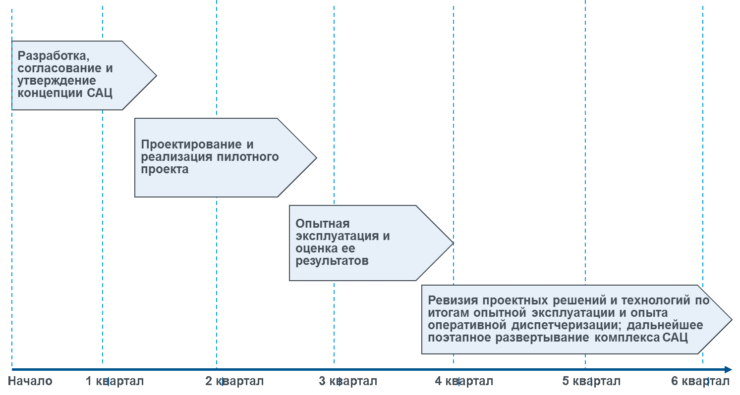 На последующих этапах, в рамках реализации утвержденной на предыдущем этапе концепции, выбранный подрядчик (или подрядчики) обеспечивают проектирование и внедрение пилотного проекта САЦ, по итогам которого будут проверены оценки эффектов и уточнены требования к дальнейшему развертыванию САЦ.