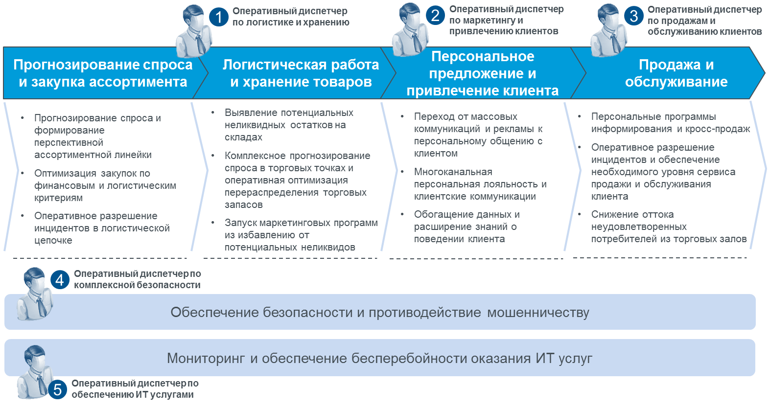 Из практических соображений, количество диспетчеров определяется основным технологическим процессом предприятия или как говорят эксперты «цепочкой добавленной стоимости». На каждом из этапов этой цепочки обеспечивается создание добавленной стоимости для клиента. Все остальные процессы, такие как бухгалтерия, подготовка налоговой и управленческой отчетности, ИТ обеспечение являются важными, но вторичными процессами по отношению к основному процессу. Ниже приведен пример такой цепочки для коммерческой торгово-розничного предприятия, включая ключевые обеспечивающие процессы: